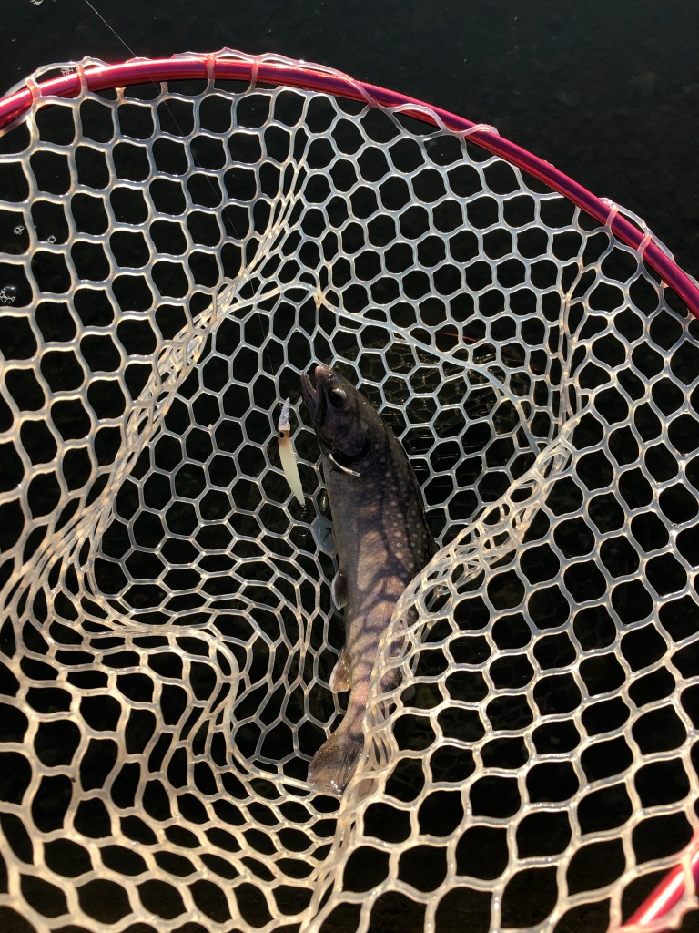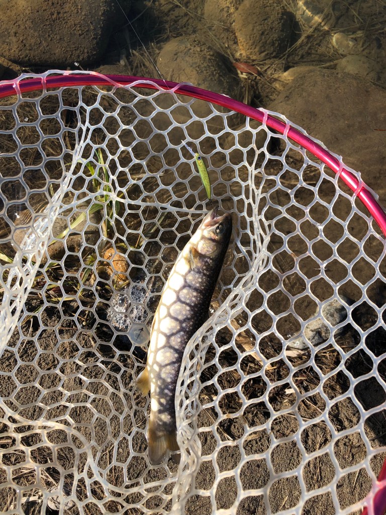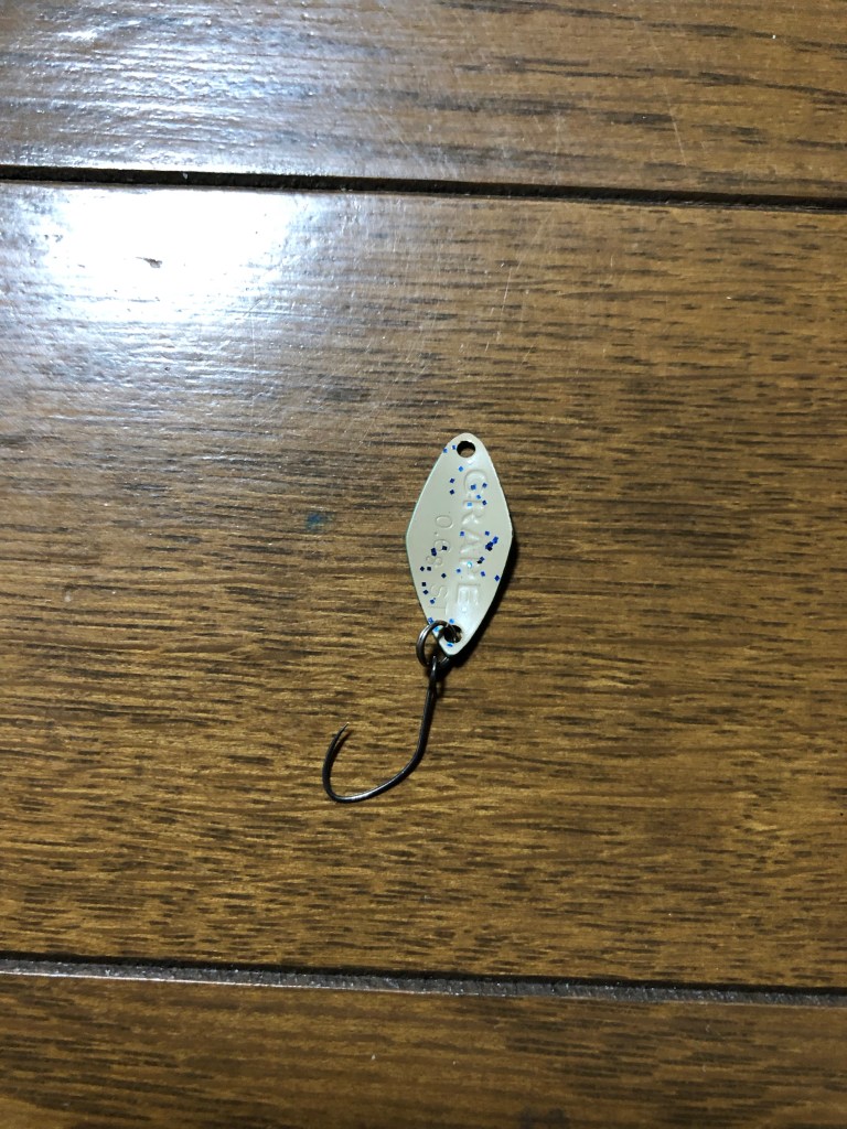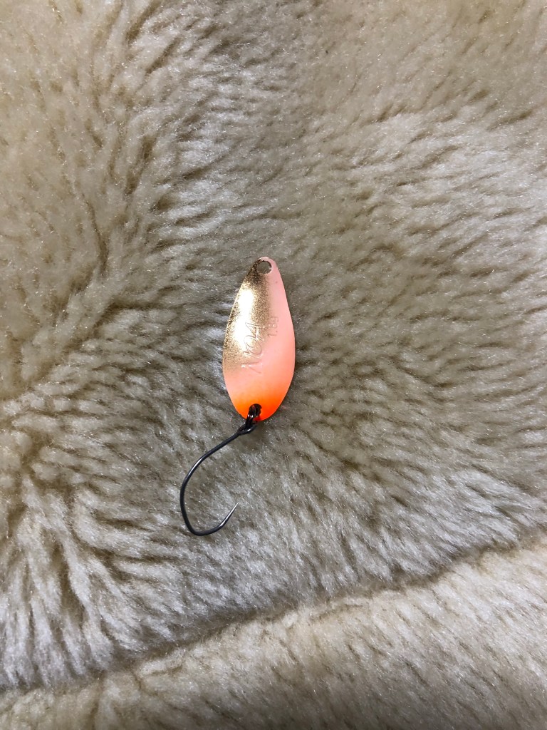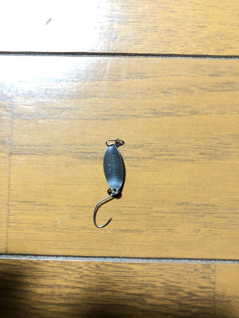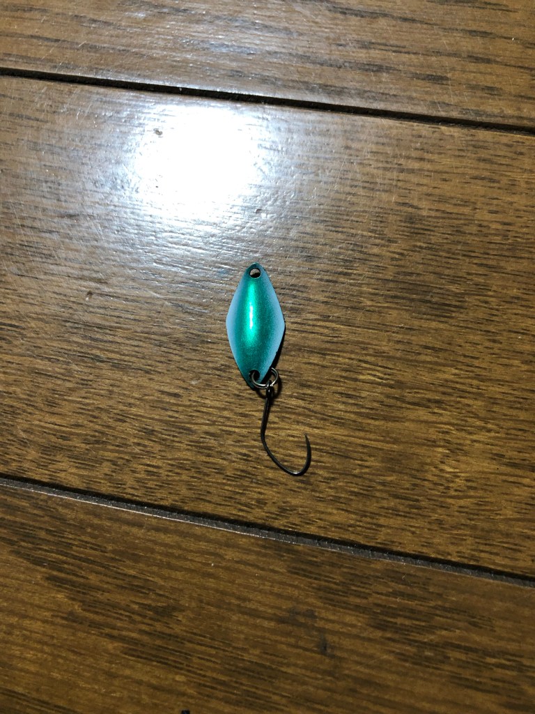 着水音が大きいと逃げるため、僕は0.4〜0.6の管釣り用マイクロスプーンで攻めてましたが、小さなワームでも釣れる模様