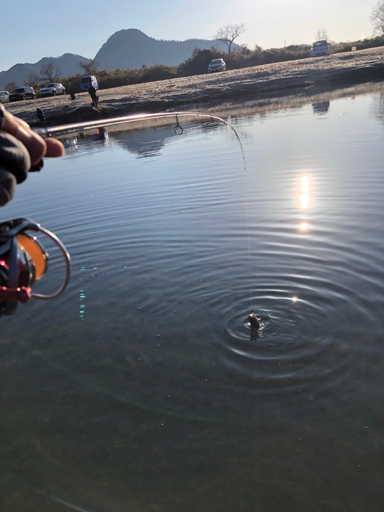 サイズが小さいため掛けたあとも岸際には近づかずにやや強引にぶっこ抜きw