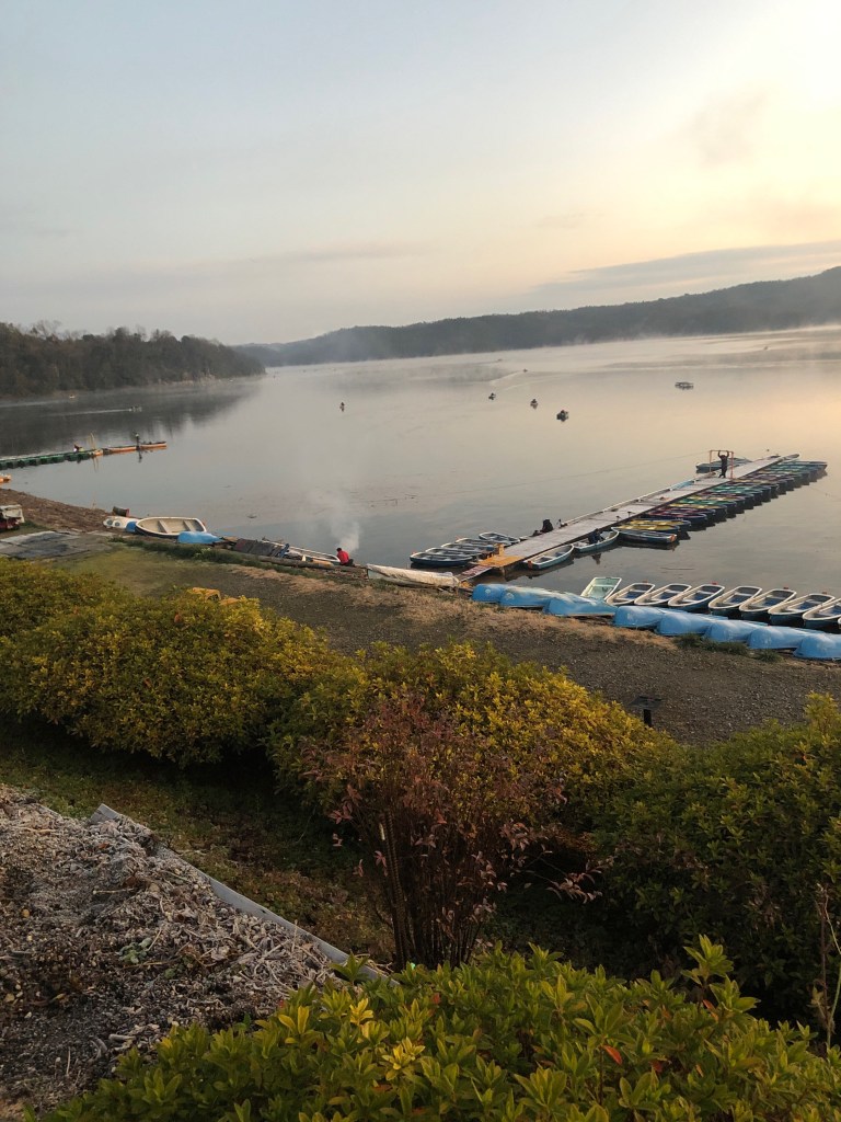 店の人に案内されて車を停め、池のほうを見るとこれまたたくさんのボートが既に浮いてる!