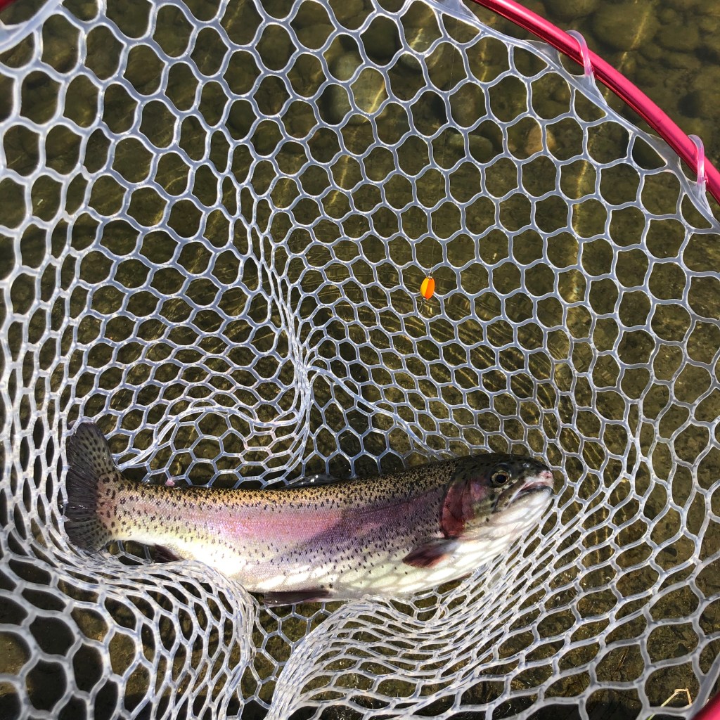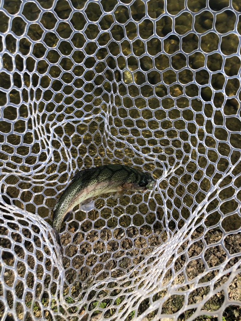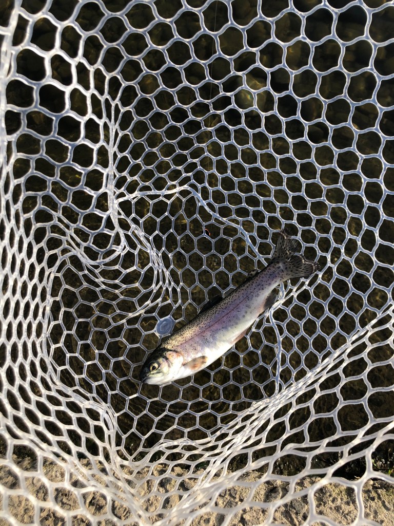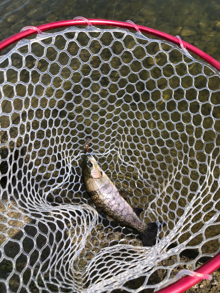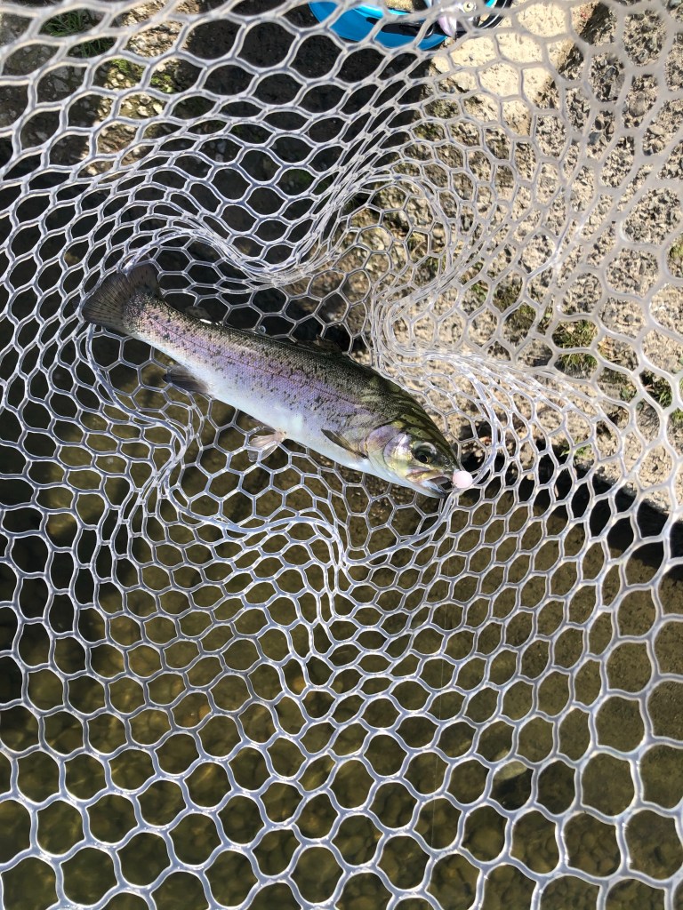 ちなみに、放流トラックが水合わせを始めた段階で「よし、放流狩り頑張るぞ」と意気込んで事前に放流のためだけに評判のいいドーナを結んでたんですが、放流が始まる前に1匹釣れて放流中は釣れないというww